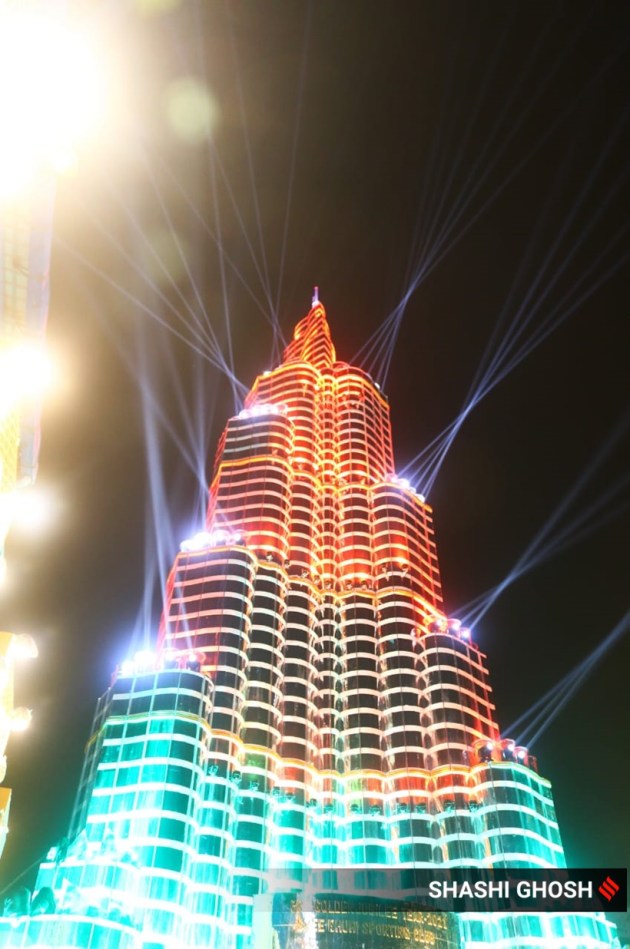 Kolkata’s Sreebhumi Sporting Club has replicated Dubai’s Burj Khalifa this year. The club has designed a 145-feet pandal which has been modelled to look like the iconic Dubai tower. (Express photo: Shashi Ghosh)