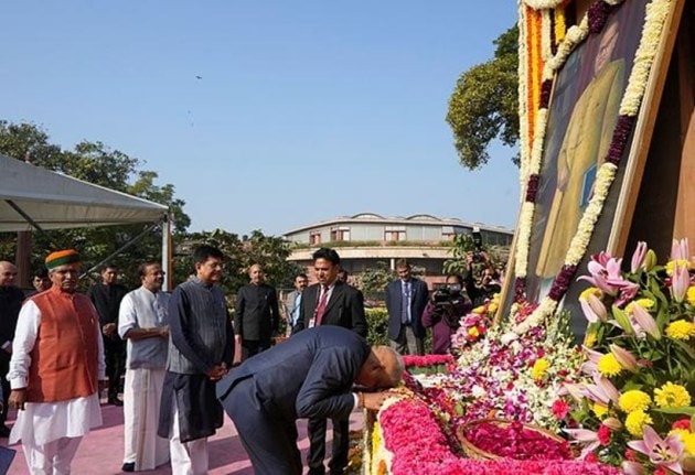 Vice President Jagdeep Dhankhar, on his first day as Chairman of the Rajya Sabha, paid tribute to Dr Bhimrao Ambedkar at the Parliament complex. (PTI)