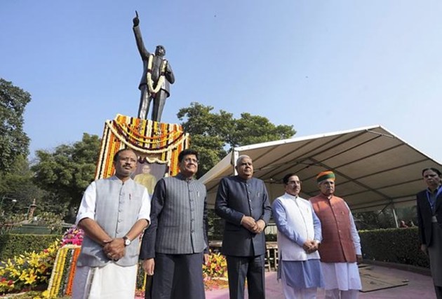 Vice President Jagdeep Dhankhar with Union Ministers Pralhad Joshi, Jitendra Singh, Arjun Ram Meghwal and V Murleedhar Rao after paying tribute to Dr Bhimrao Ambedkar at Parliament complex. (PTI)