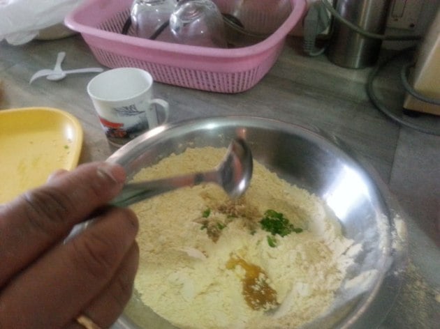 Mix besan, sooji, water, oil, salt, sugar, turmeric, chilli paste and ginger. (Source: Ashima Goyal Siraj)