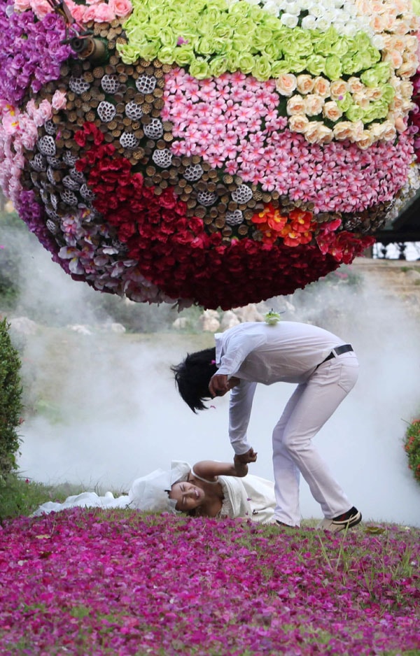 Thai groom and his bride fly while attached to cables during a wedding ceremony ahead of Valentine's Day in Thailand. (Reuters)