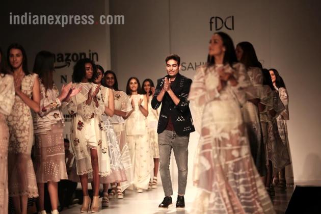 Fashion designer Sahil Kocchar walked down the ramp with the models at the AIFW SS 2018. (Source: Express Photo by Amit Mehra)