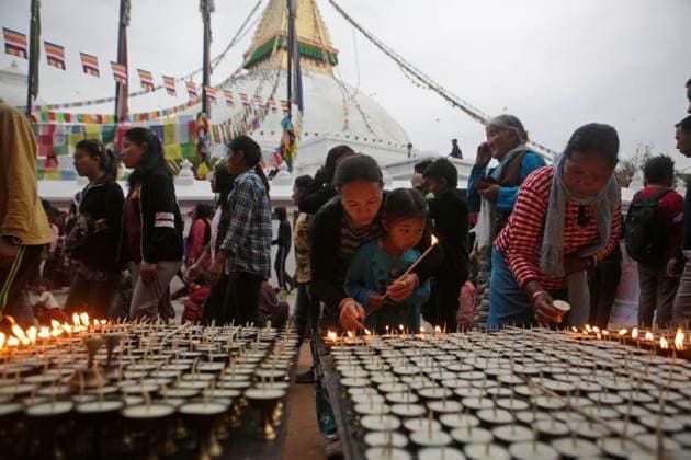 Buddhists light butter lamp during Buddha Purnima at Boudhanath Stupa in Kathmandu, Nepal. (Source: AP)