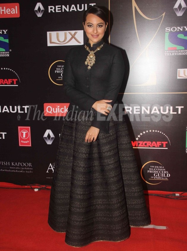 Sonakshi Sinha has a gorgeous face and we actually love how stunning she looks neck-up but other than that, there's nothing that we like about this look. The Shantanu and Nikhil jacket and lehenga did not do justice to her curves and tall frame. She should have picked up something else for the Star Guild Awards red carpet appearance. (Photo: Varinder Chawla)