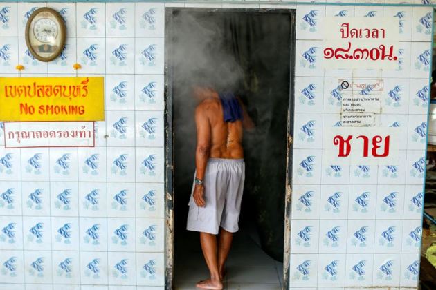 Patients take a cool shower after the steam bath. (Source: Photo by Jorge Silva/Reuters)