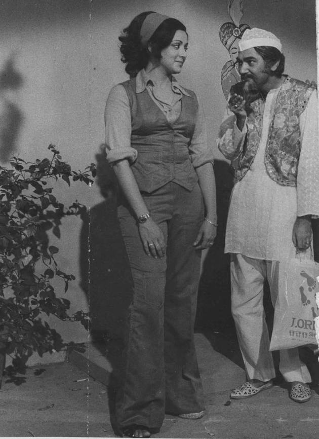 Film Star Amitabh Bachchan, Hema Malini and Sudhir in Satte Pe Satta. Her classic hairstyle with the pink shirt cannot be pulled off by everyone. Yet, she does it with utter grace. (Express archive photo)