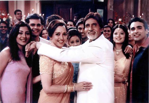 Actor Hema Malini and Amitabh Bachchan in the film Baghban. Here she sports a light beige saree with a heavy bun, making way for the classic early 2000's fashion! (Express archive photo)