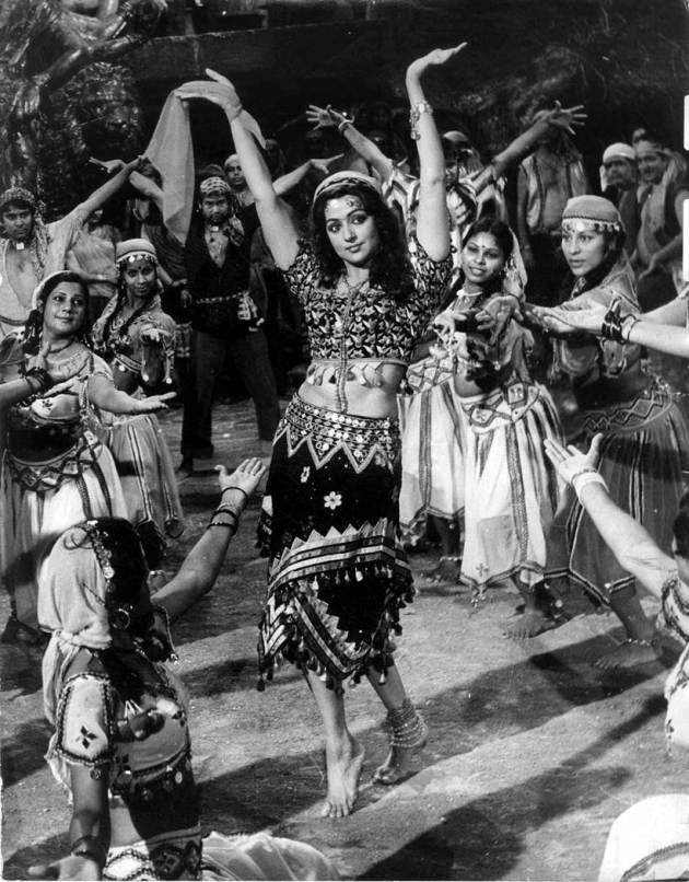 Film star Hema Malini in Dream Girl has is seen in an iconic look, dressed in a heavily embellished blouse, teamed with a knee-length skirt and numerous anklets to enhance the overall look. (Express archive photo)