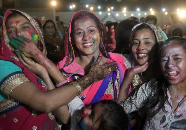 Women from the Pakistani Hindu community celebrate the festival of colours with full fanfare at a temple in Lahore. (Source: AP)