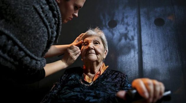 Stela Krashes, 85, (L) a Holocaust survivor gets her eye make-up done. (Source: Reuters)