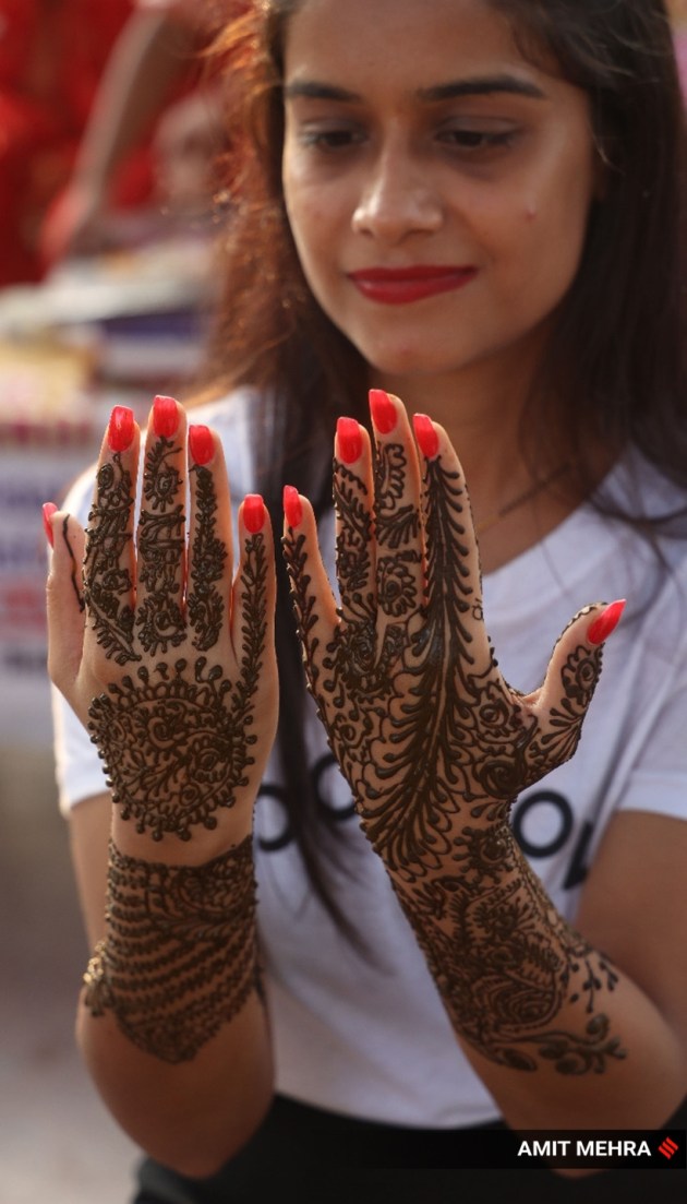 Women show their hands adorned with mehndi on the eve of Karwa Chauth festival in Jammu. (Photo: PTI)