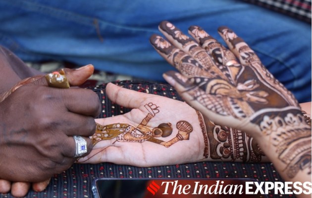 A woman getting henna applied on her hands in Ludhiana. (Express photo by Gurmeet Singh)