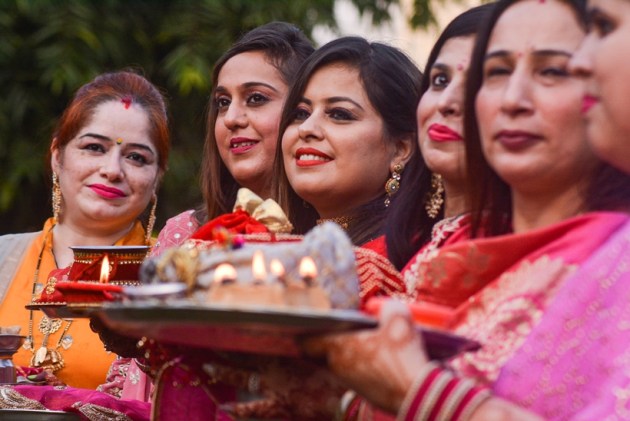 Married women perform rituals on the occasion of Karwa Chauth festival in Patna. (Photo: PTI)