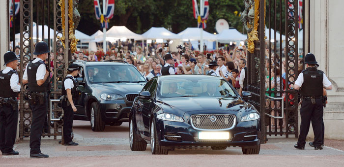 A Jaguar car is driven into the Forecourt of Buckingham Palace bringing the news to announce the birth of a baby boy. (AP)