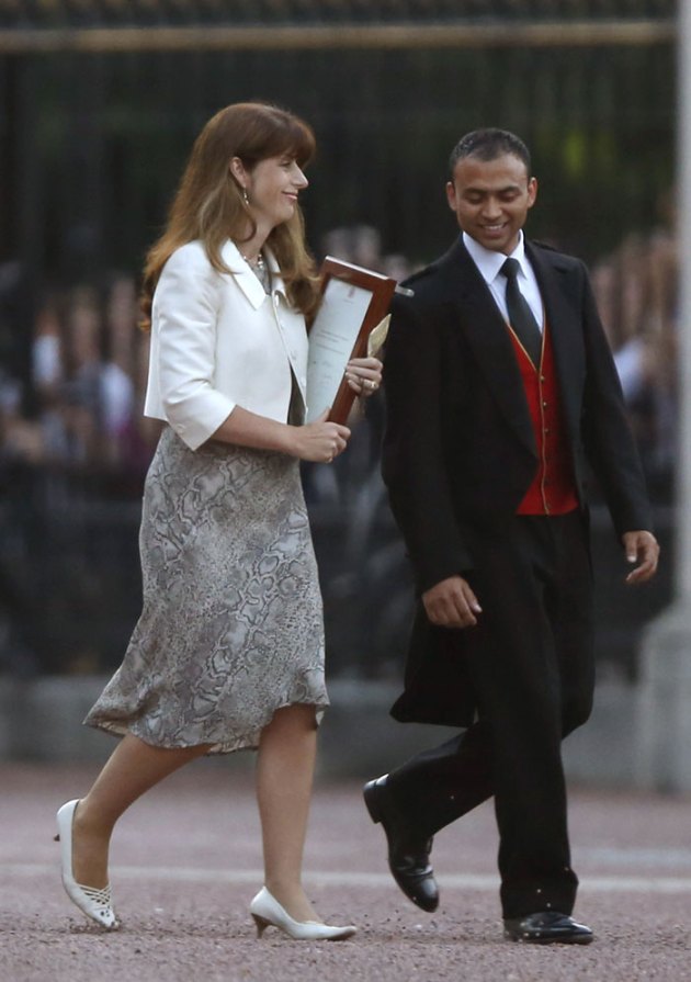 The Queen's Press Secretary Ailsa Anderson with Badar Azim, a footman, places an official document to announce the birth of a baby boy. (AP)