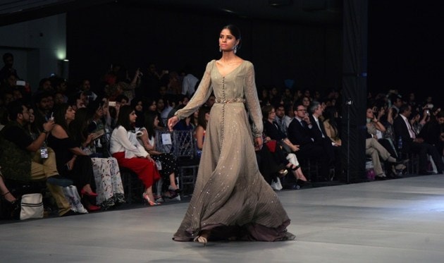 Ali Xeeshan's show, labelled "Voodoo", depicted the frenzy of a journey from the lowest level of darkness to the highest point of joy. His ensemble was dominated by silver glitter on his designs. With smooth lines, sharp cuts and whole silver dresses, Ali received a huge applause from the audience. (Source: AP)