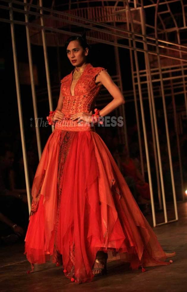 The gold collection introduced gold as the new shade of the season. It mostly had drape gowns and sarees with pallu highlighting the Indian sensibilities. In the second section, Tarun reinvented the sarees with belts, cape and bustiers in hues of pink, ivory, beige and red. (IE photo: Amit Mehra)