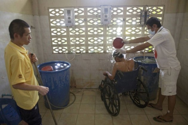 A patient is given bath at a hospice for those dying of AIDS at the Buddhist temple Wat Prabat Nampu in Lopburi province, north of Bangkok. From 1992, the temple has provided housing for HIV positive patients and palliative care for those in the final stages of the AIDS disease. Data from 2013 estimates Thailand has 450,000 people living with HIV/AIDS, but only 353,000 have access to life-saving antiretroviral drugs. (Source: Reuters)