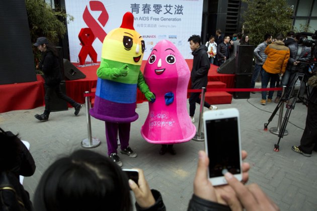 Condom mascots pose for photos at an event to promote awareness of HIV in Beijing, China. (Source: AP)