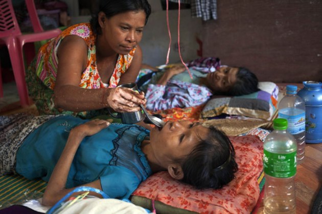 A woman gives water to an HIV patient receiving treatments at HIV/AIDS Care Center founded by Phyu Phyu Thin, a parliament member of Myanmar opposition leader Aung San Suu Kyi's National League for Democracy party, on the outskirts of Yangon, Myanmar. There are about 200,000 HIV patients in Myanmar out of which about 125,000 patients require the lifesaving antiretroviral treatment. According to a health ministry official only about 87,500 of them received the ART treatment. (Source: AP)