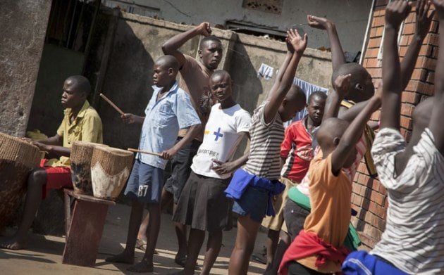 A dozen children perform a traditional courtship dance from eastern Uganda as part of a platform for changing attitudes among youth using dance, drama and popular hip hop music, at the Treasure Life Center in the Kamwokya slum of Kampala, Uganda. As World AIDS Day is marked on Dec. 1, Uganda and many other African countries are continuing their battle against HIV and AIDS, and Ugandan street activists like 26-year-old Hood Katende are trying to use music and drama to stem a troubling resurgence of HIV, which now infects more than 500 young women between the ages of 15 and 24 each week, according to the Uganda AIDS Commission. (Source: AP)