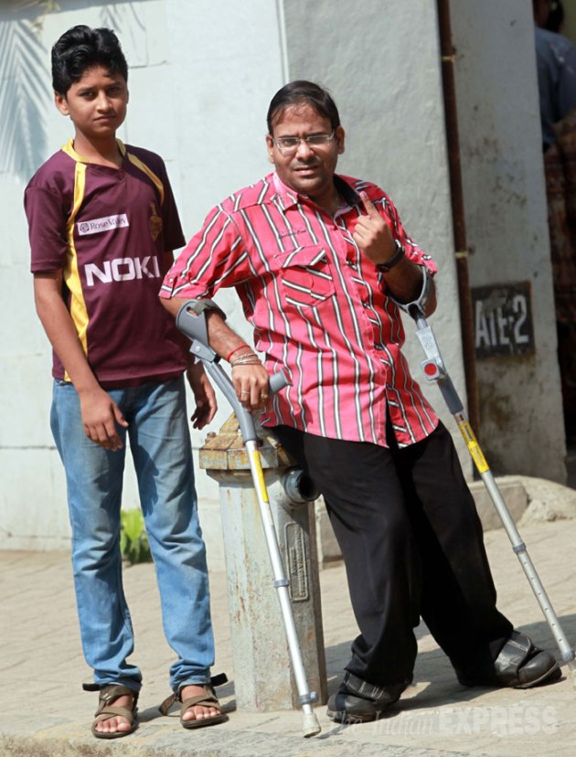 A differently abled resident arrives with his wife and son to cast his vote. (Source: Express photo by Kevin DSouza)