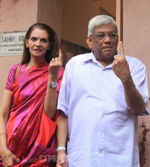 Former MP Milind Deora and his wife Pooja Deora after casting their votes in Mumbai. (Source: Express Photo by Ganesh Shirsekar)