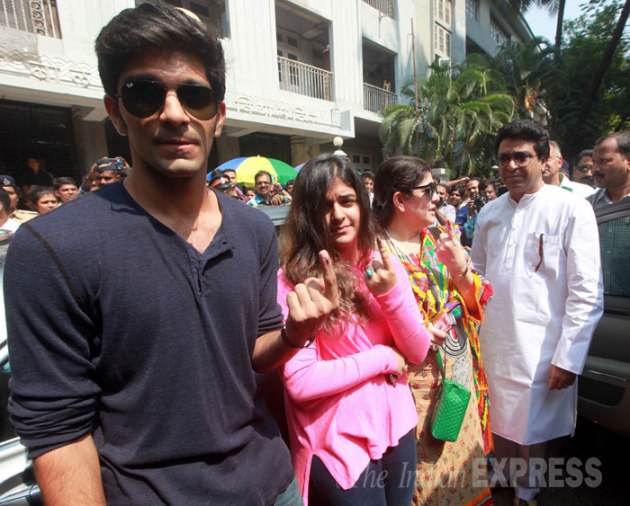 MNS leader Raj Thackeray arrived with his family to cast vote. He can be seen here with his wife, Sharmila Thackeray. (Source: Express photo by Kevin DSouza)