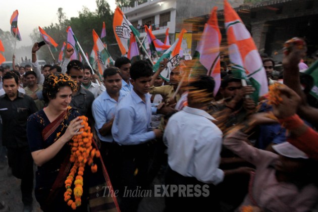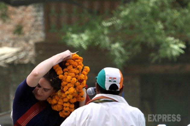 The zaalim, he underlines, in case someone has missed the point, are those contesting against Rahul Gandhi in Amethi. He has barely finished his poem when the attention of the crowd turns from him to Priyanka striding in. They crane their necks to get a better look at her and fall silent as she speaks. “Have you been waiting for long? Two hours? Aur aaj toh dhoop bhi hai (It’s a hot day). But you have waited because of your love for us,” says Priyanka, dressed in a navy blue sari. (IE Photo: Ravi Kanojia)