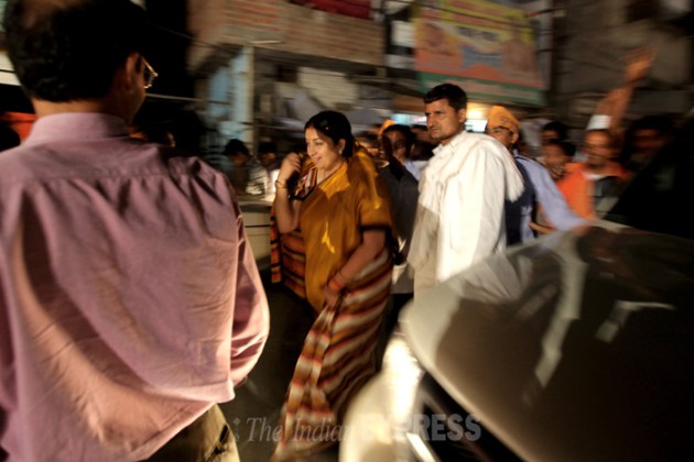 Meanwhile, at Salon party candidate Smriti Irani, finally arrives at 9 pm and hits the ground running. “When I tell people I am going to Amethi, they tell me, it’s the Gandhis’ constituency, it must be swarg (heaven),” she tells the workers, “Par swarg mein gaddhe to nahin hote (But there can’t be potholes in heaven).” (IE Photo: Ravi Kanojia)