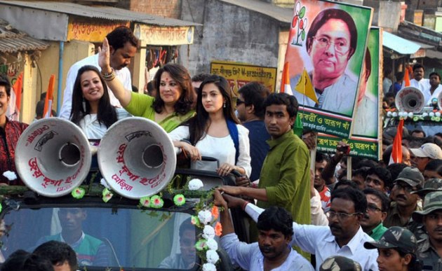 TMC candidate Moonmoon Sen with her Riya and Raima during her election campaign in Bankura constituency in West Bengal on Tuesday. (PTI)