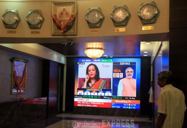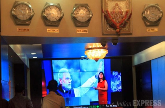 Tracking the extremely strong sentiment in the equity markets that recorded lifetime highs, as many as 220 stocks hit one-year highs in the morning trade on the BSE following election result trends. (Source: Express Photo by Ganesh Shirsekar)