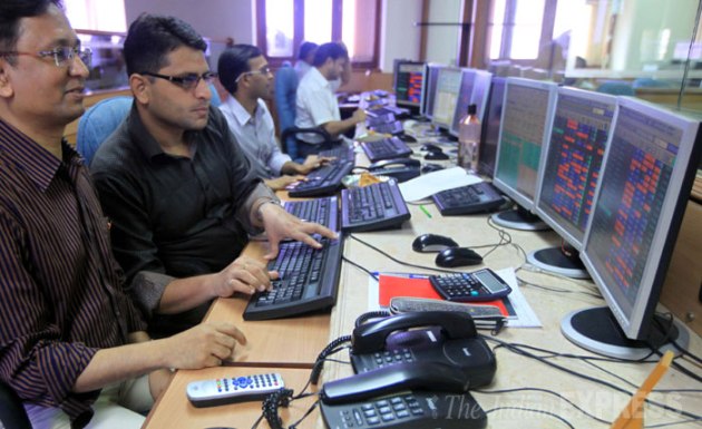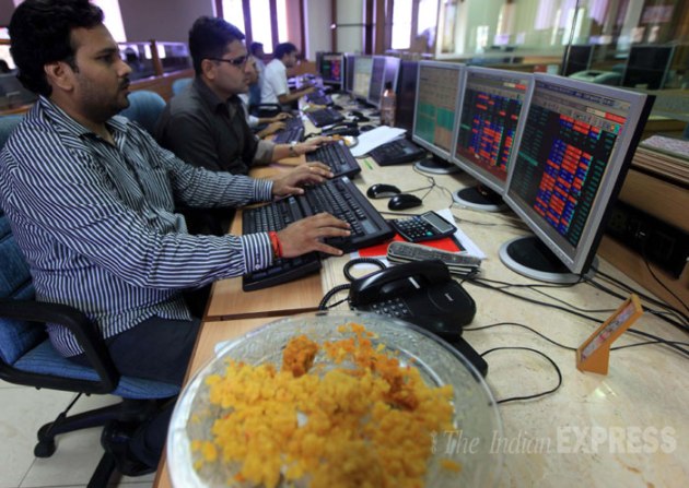 As result trends poured in this morning, the BSE Sensex climbed 1,470.03 points to an all-time high of 25,375.63. However, profit-booking trimmed early gains and the Sensex was quoting 941.81 points, or 3.94 per cent higher at 24,847.41 at 1230 hrs. (Source: Express Photo by Ganesh Shirsekar)