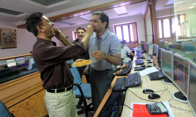 Employees celebrate as the Sensex crossed 25000 points after BJP won the Lok Sabha elections 2014 at Dalal Street, Mumbai. (Source: Express Photo by Ganesh Shirsekar)