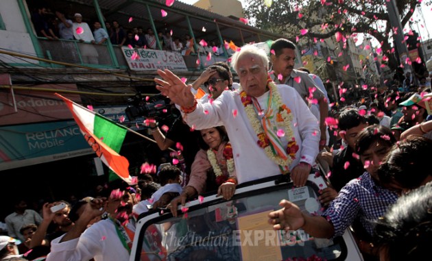Seen here is Congress candidate and Union minister Kapil Sibal at a roadshow in the Jama Masjid area. He is taking on BJP's Harsh Vardhan and Ashutosh of AAP in Chandni Chowk. (IE Photo: Ravi Kanojia)