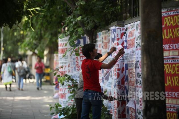 Over the past few weeks at Delhi University’s North Campus, a multitude of colourful posters have taken over every inch of available space — from walls and vehicles to even statues. In bold print, the posters call out to each passerby to vote for their party in the upcoming DU Students’ Union (DUSU) polls on September 11. (Source: Photo by Tashi Tobgyal)