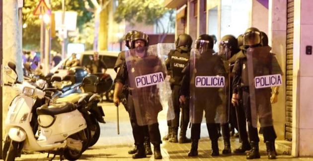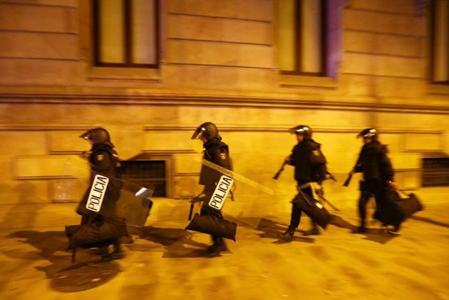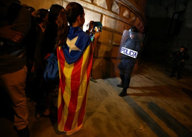 Demonstrators demanding for independence films officers of the Spanish National Police outside the High Court of Justice of Catalonia in Barcelona. (Source: Reuters)