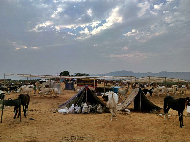 People sitting outside their temporary tents at the Pushkar Camel Fair. (Source: Express photo by Abhimanyu Chakravorty)