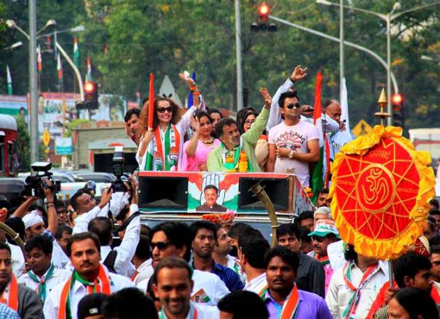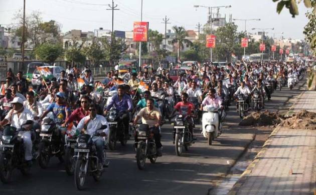 Congress candidate Madhusudan Mistry's election campaign roadshow passes through the city on Friday. (Express Photo By Bhupendra Rana)