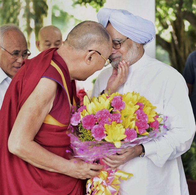 Former Prime Minister Manmohan Singh during a meeting with Tibetan Spiritual leader, Dalai Lama at his residence in New Delhi on Monday. (Source: PTI)