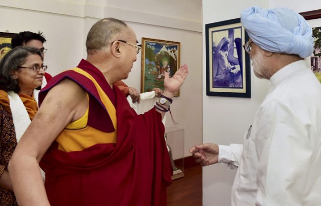 Tibetan Spiritual leader, Dalai Lama gestures during a meeting with former Prime Minister Manmohan Singh in New Delhi on Monday. (Source: PTI)