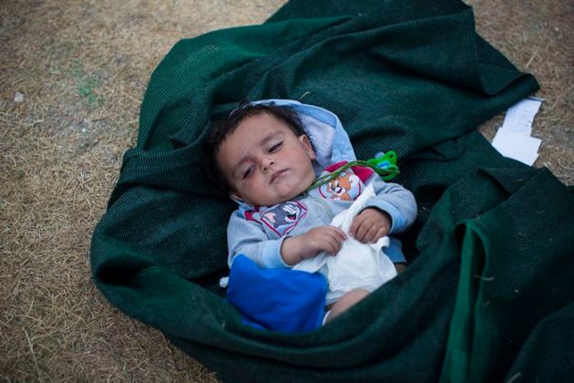 A baby lays on the ground as his mother waits for the registration and the issuing of travel documents of her family at a soccer stadium in Mytilene, on the northeastern Greek island of Lesbos. More than 15,000 refugees and migrants are stranded on the Aegean island, awaiting screening before they can board a ferry to the Greek mainland from where they head north through Macedonia, Serbia and Hungary to seek asylum in more prosperous European countries. (Source: AP)
