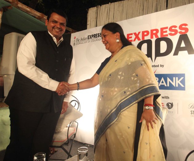Maharashtra CM Devendra Fadnavis and Vasundhara Raje greet each other at the Express Adda. (Source: Express photo)