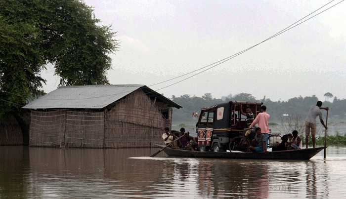 Villagers carry an auto rickshaw on a boat to safer areas in flood affected Balimukh village of Morigaon district, Assam on Sunday. (Source: PTI)
