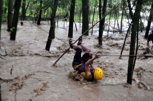 A youth attempts to move at safer place using a rope at Akran Nowpora in Kulgam after heavy rains deluged nearby villages. (Source: PTI)