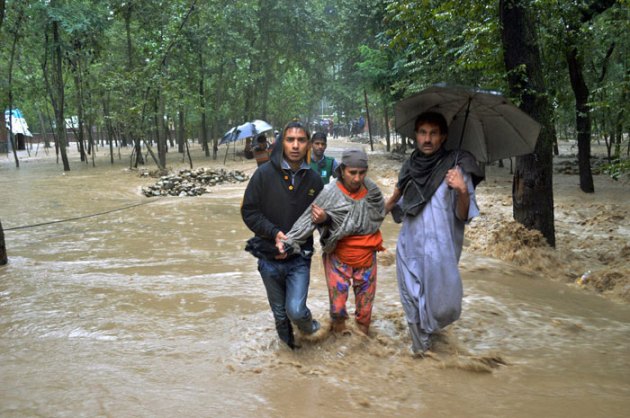 Locals rescuing flood-affected villagers at Akran Nowpora in Kulgam after heavy rains deluged nearby villages. (Source: PTI)