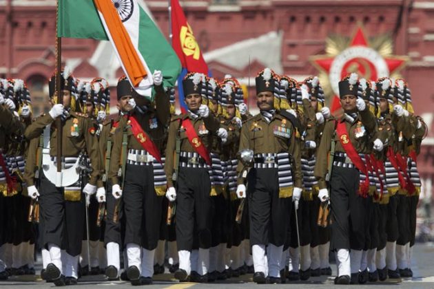 Indian army soldiers march along the Red Square during the Victory Parade marking the 70th anniversary of the defeat of the Nazi Germany in World War II, in Moscow, Russia, Saturday, May 9, 2015. (Source: AP)