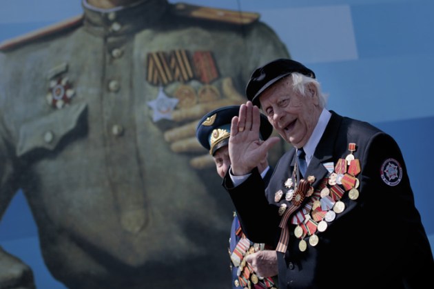 An unidentified Russian WWII veteran salutes as he walks, after the Victory Parade marking the 70th anniversary of the defeat of the Nazi Germany in World War II, in Red Square, Moscow, Russia, Saturday, May 9, 2015. (Source: AP)