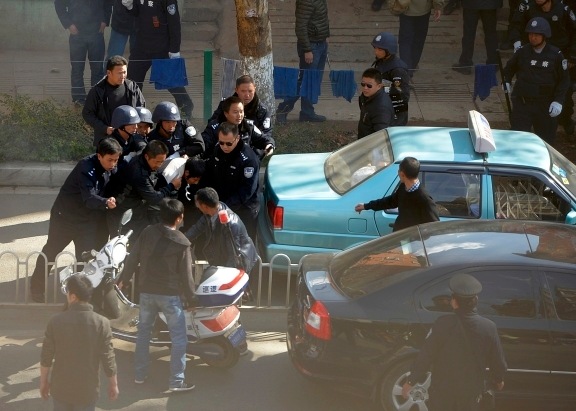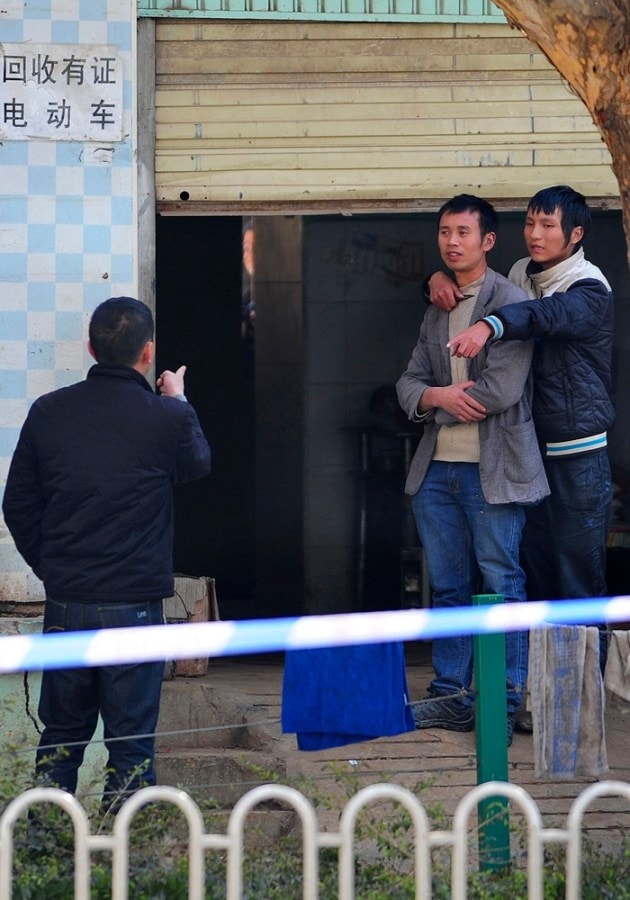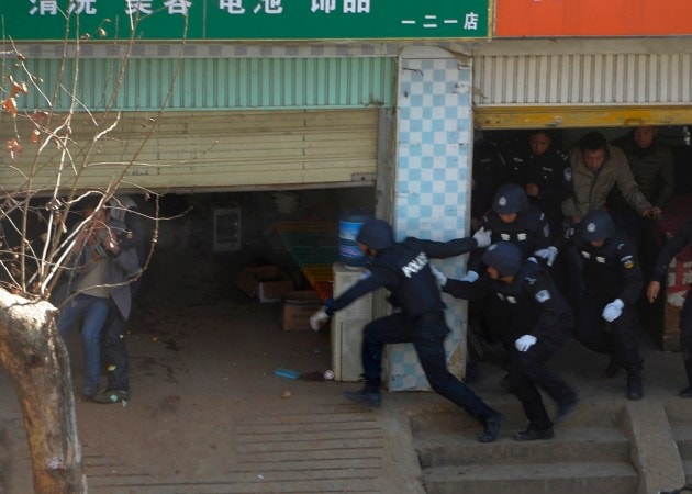 (2nd L, partially obscured) in Kunming, capital of China's southwest Yunnan province, January 9, 2014. Police successfully rescued the hostage and detained the suspect after a four-hour standoff. The suspect had a construction worker taken hostage with a knife, after being chased by police for stealing a mountain bike, local media reported. Picture taken January 9, 2014. REUTERS/Stringer (CHINA - Tags: CRIME LAW) CHINA OUT. NO COMMERCIAL OR EDITORIAL SALES IN CHINA
