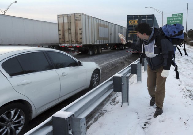 Matthew Miller walks along the Southbound Connector offering peanut butter and jelly sandwiches and hot drinks to motorists stuck in traffic due to a snow storm in Atlanta, Georgia.